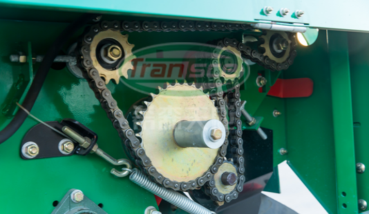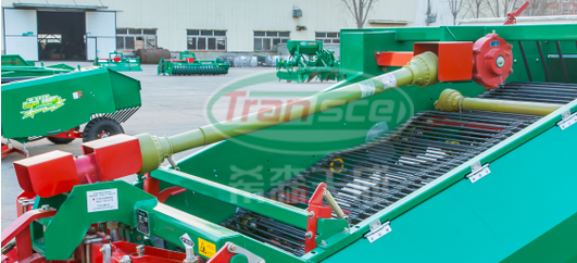 4、格栅式输送分离筛及抖动轮组合:输送带由驱动轮驱动,驱动轮为橡胶齿,与钢栅条啮合好,磨损轻,寿命长;这种型式的输送分离筛使用可靠,马铃薯破损少。抖动轮可抖动输送分离筛,提高马铃薯与土壤的分离能力。